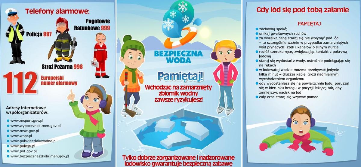 - Korzystaj wyłącznie ze specjalnie przygotowanych lodowisk. Pod żadnym pozorem nie wchodź na lód zamarzniętych zbiorników wodnych, jezior, kanałów, stawów, itp. Pozornie tylko gruby lód może w każdej chwili załamać się pod Twoim ciężarem;